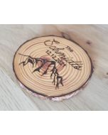 Our beautiful personalized coasters are made from authentic and quality pine wood slices. Coasters are engraved with your chosen text and a mountian with trees.